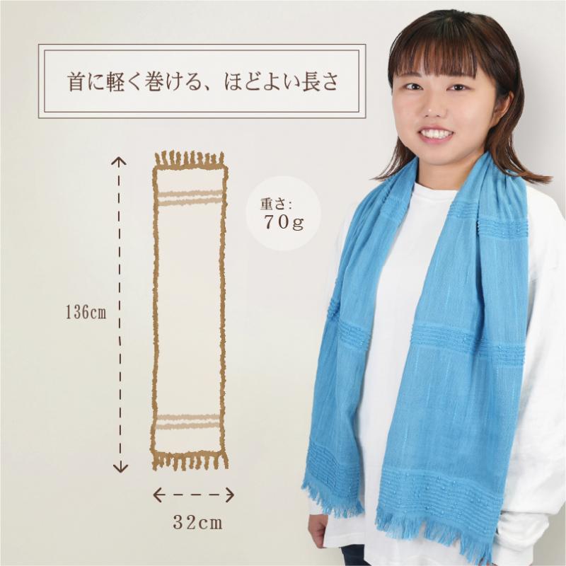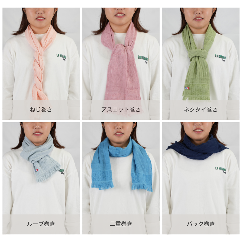 ワンループ巻き、肩掛け、ハーフ巻きなど、いろいろな巻き方を楽しめます。