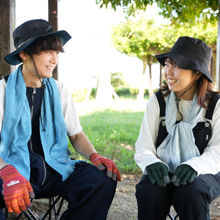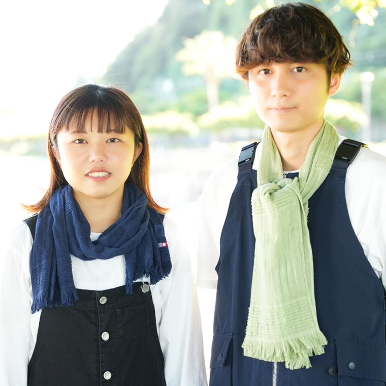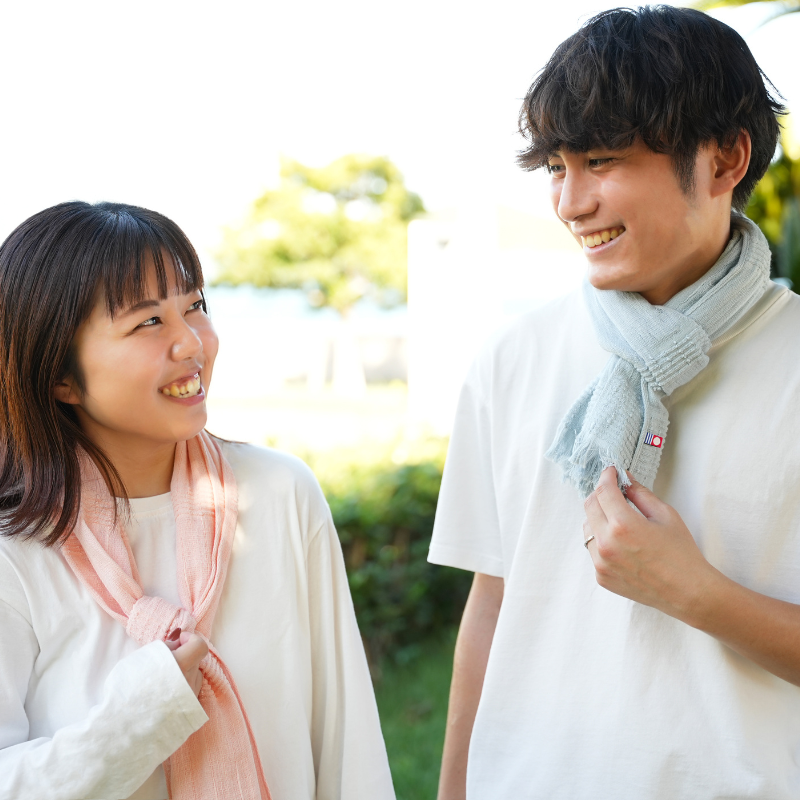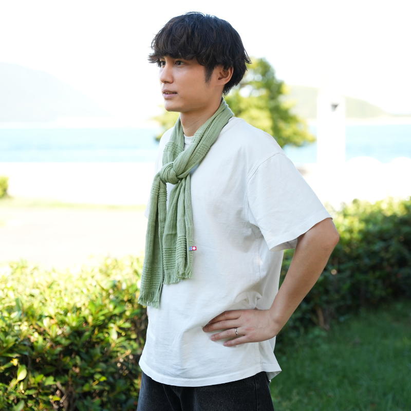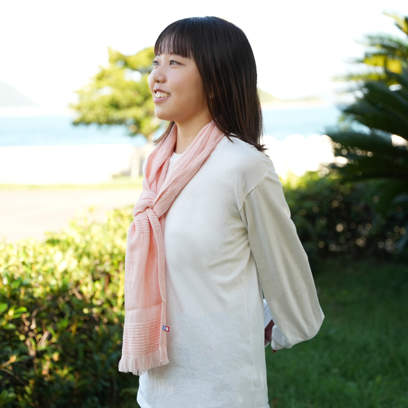 春夏は汗や日差しをやさしくガード、秋冬はふんわりと首元を包み込みます。